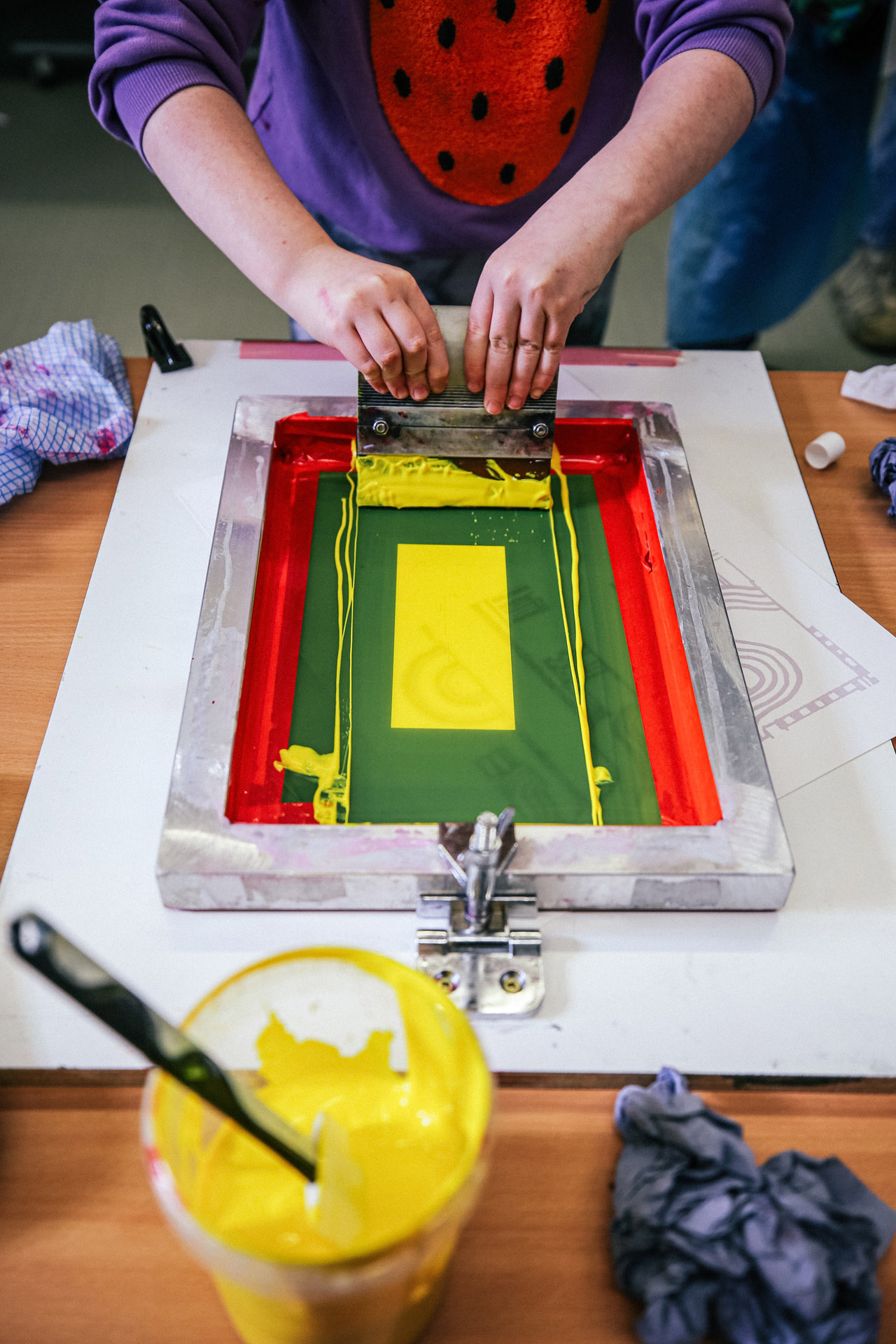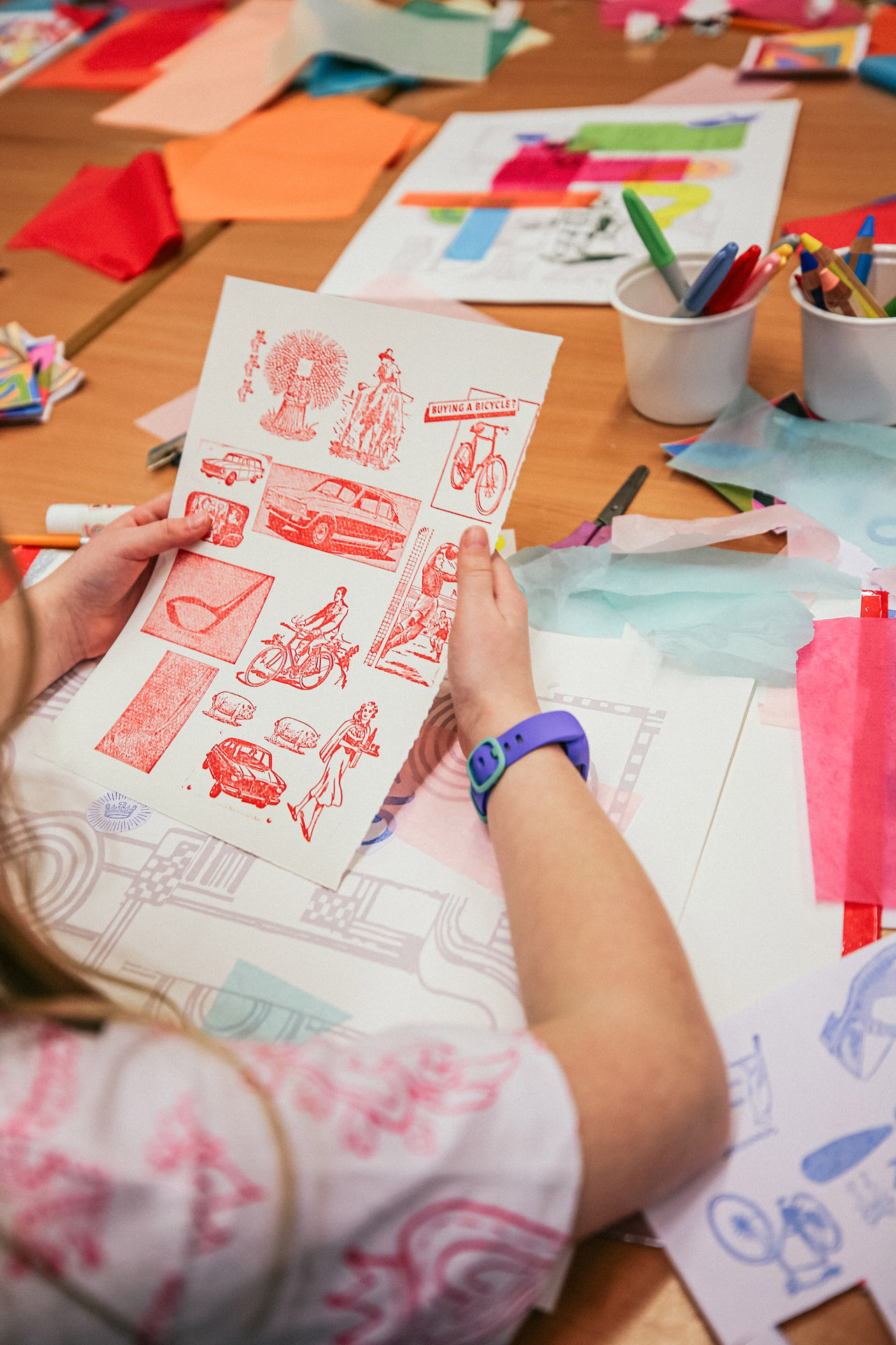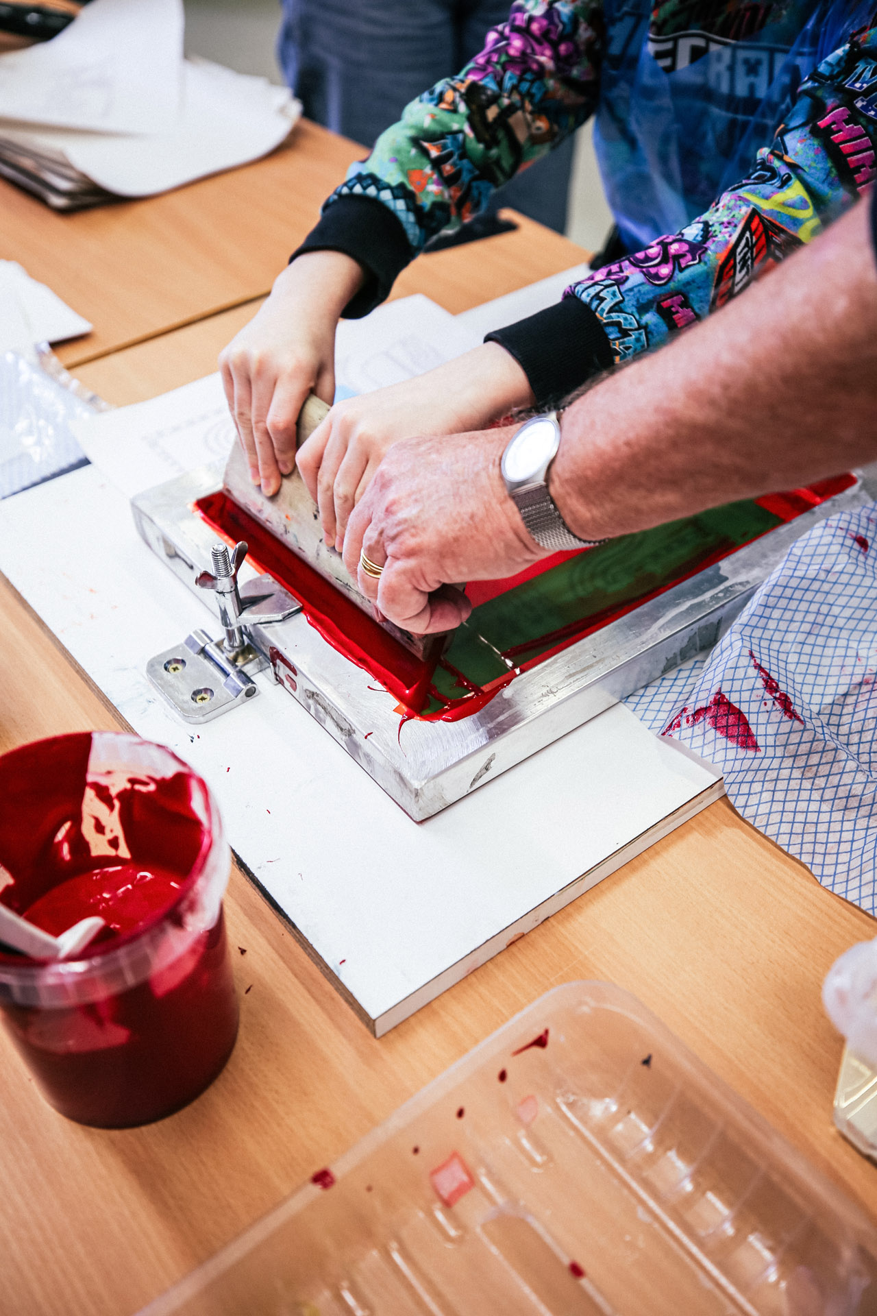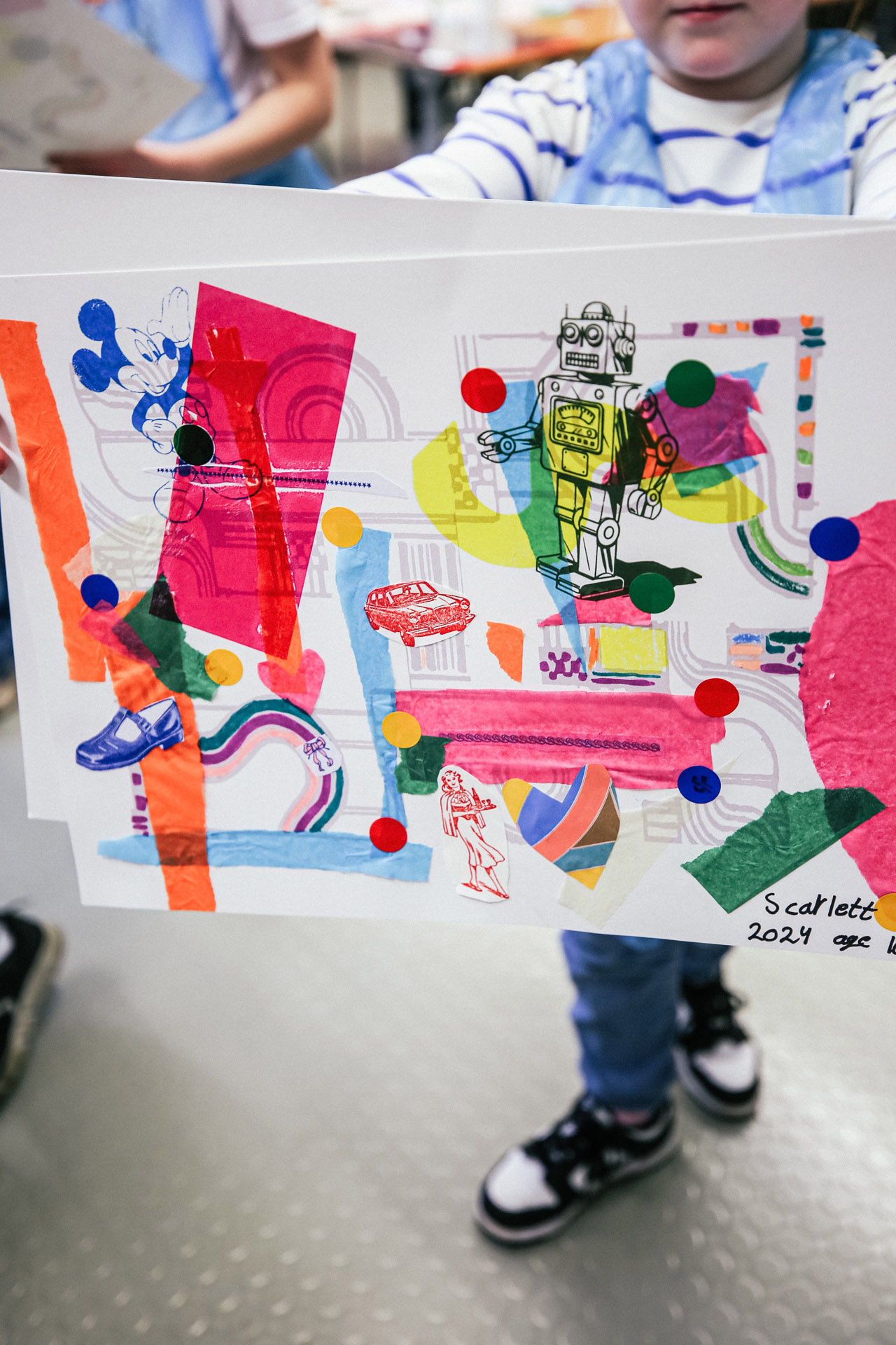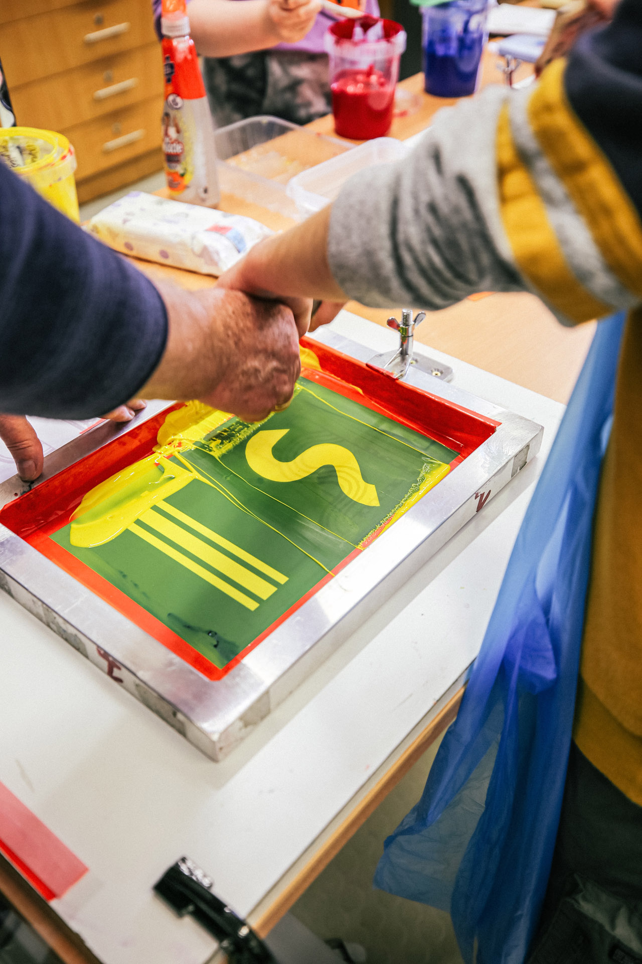 Seacourt brought a taste of this collaborative process of printmaking to a group of children at the Ulster Museum in Spring 2024. In a participative workshop we showed kids how the artist would use forms and layers to build up bright and exciting pop art prints. The work created by the groups really showed how dynamic and fun screenprinting is.