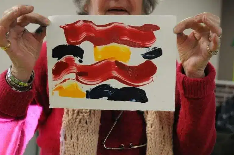 The featured body of work was created by residents of the Samuel Kelly Care Home as they responded to old family films set in Portrush and Bangor Town Centres. From revisiting dances and outdoor festivities, the participants felt particularly inspired by the way in which the clothes moved with the dancers. This was then fed into their work through fleeting brushstrokes and letterpress text.
